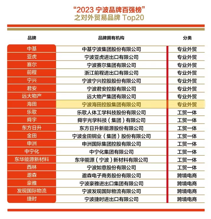 5月10日,“2023寧波品牌百強榜”正式發布,該榜單是由寧波市甬商發展研究會牽頭組織并聯合中國社科院品牌戰略研究課題組和中國市場學會、中國品牌研究中心等國內權威機構共同主辦指導,被業界稱為寧波品牌界的“奧斯卡”獎,對寧波整體品牌形象的樹立起著重要作用。在此次榜單中,寧波海田控股集團有限公司榮登“2023寧波品牌百強榜”之對外貿易品牌Top20。